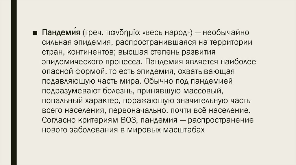 ■ Пандеми́я (греч. πανδημία «весь народ») — необычайносильная эпидемия, распространившаяся на территории