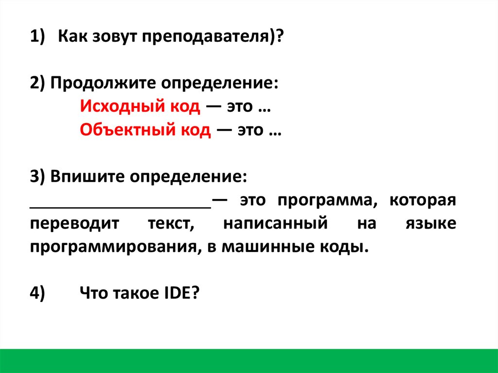 1) Как зовут преподавателя)?2) Продолжите определение: