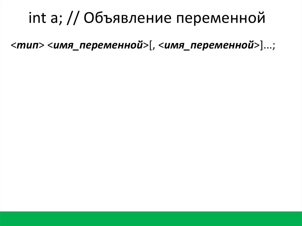 int a; // Объявление переменной<тип> <имя_переменной>[, <имя_переменной>]...;