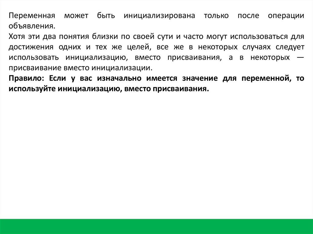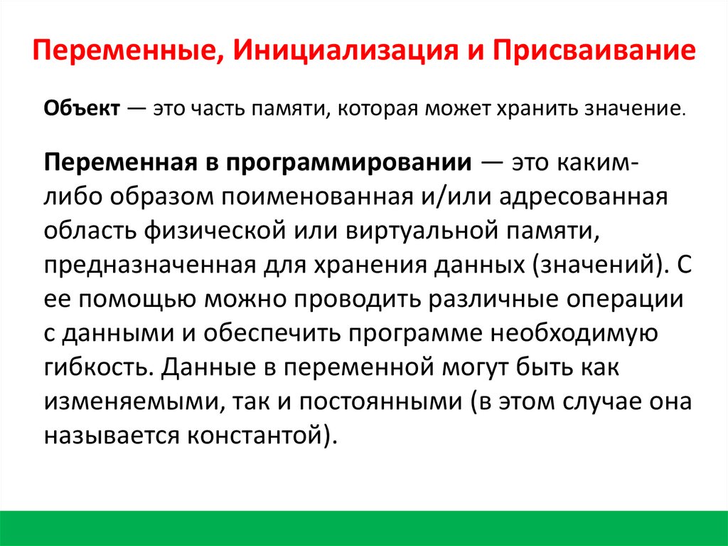 Переменные, Инициализация и ПрисваиваниеОбъект — это часть памяти, которая может хранить значение.