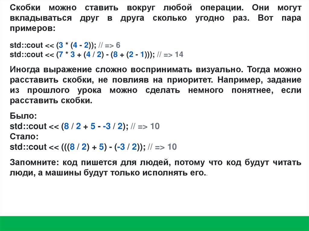 Скобки можно ставить вокруг любой операции. Они могутвкладываться друг в друга сколько угодно раз. Вот пара