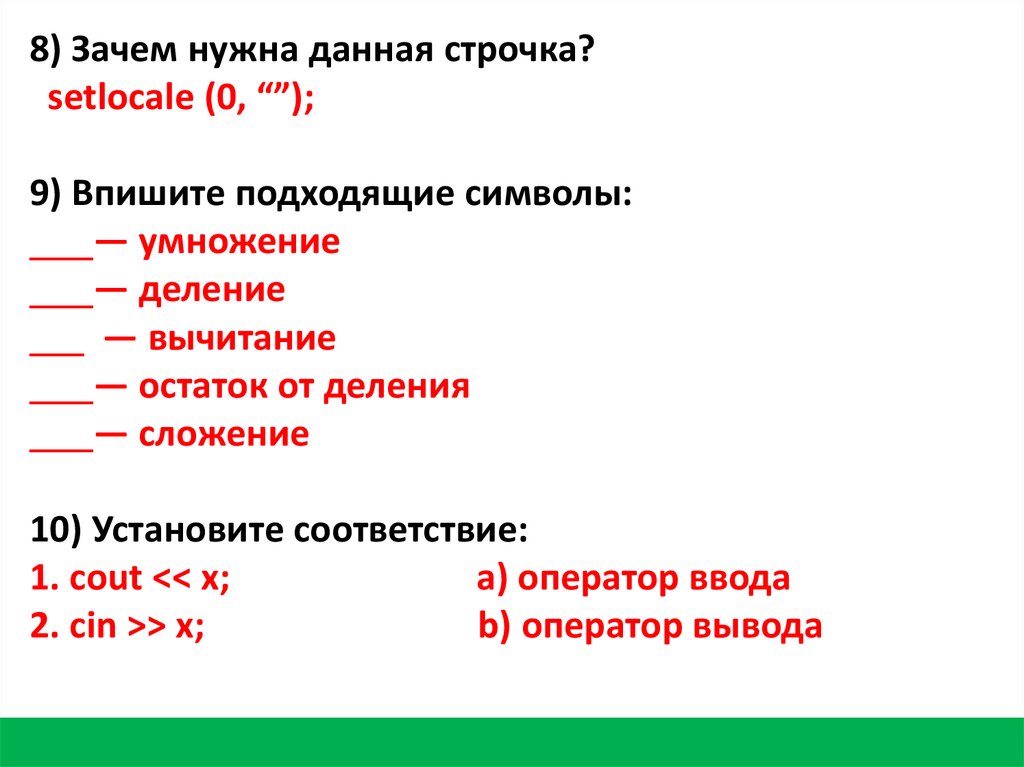 8) Зачем нужна данная строчка?setlocale (0, “”);