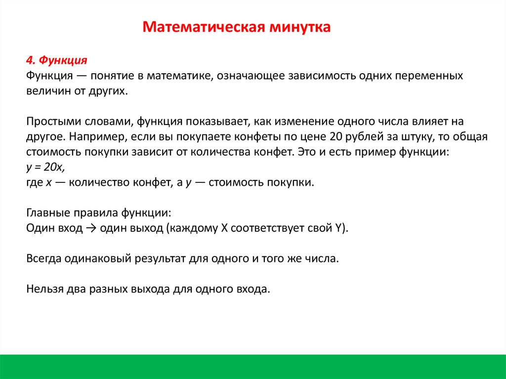 стоимость покупки зависит от количества конфет. Это и есть пример функции: