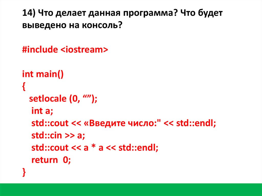 14) Что делает данная программа? Что будетвыведено на консоль?