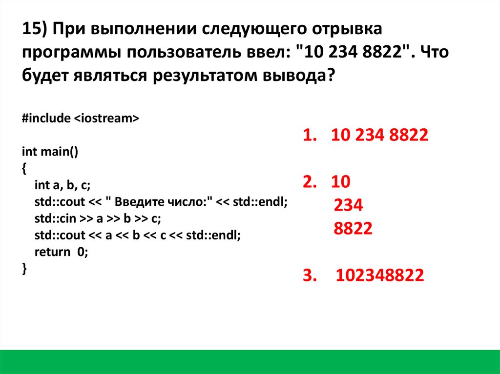 15) При выполнении следующего отрывкапрограммы пользователь ввел: "10 234 8822". Что