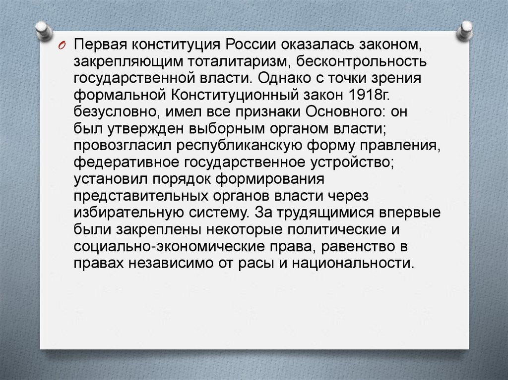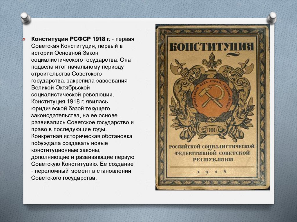 O Конституция РСФСР 1918 г. явиласьпервой Советской Конституцией, первой в