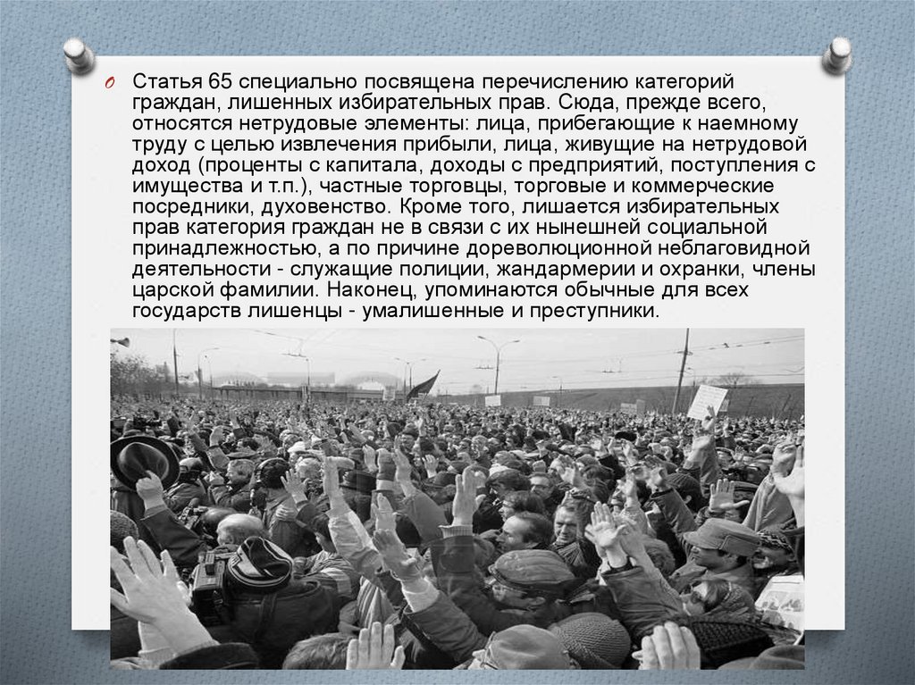 O Статья 65 специально посвящена перечислению категорийграждан, лишенных избирательных прав. Сюда, прежде всего,