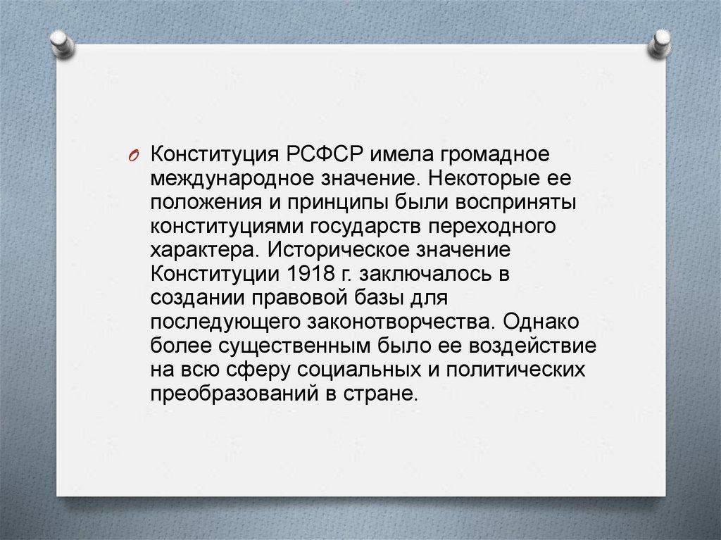 O Конституция РСФСР имела громадноемеждународное значение. Некоторые ее