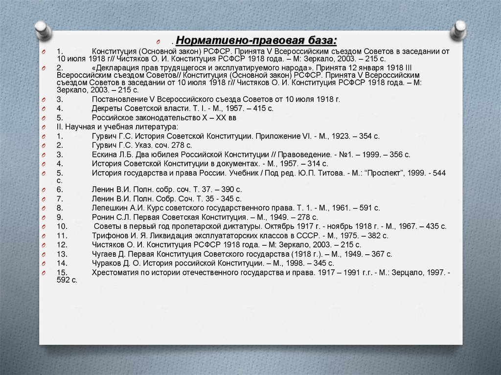 Чистяков О. И. Конституция РСФСР 1918 года. – М: Зеркало, 2003. – 215 с.