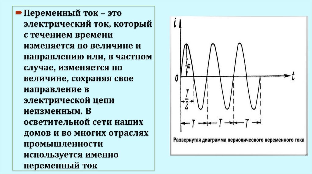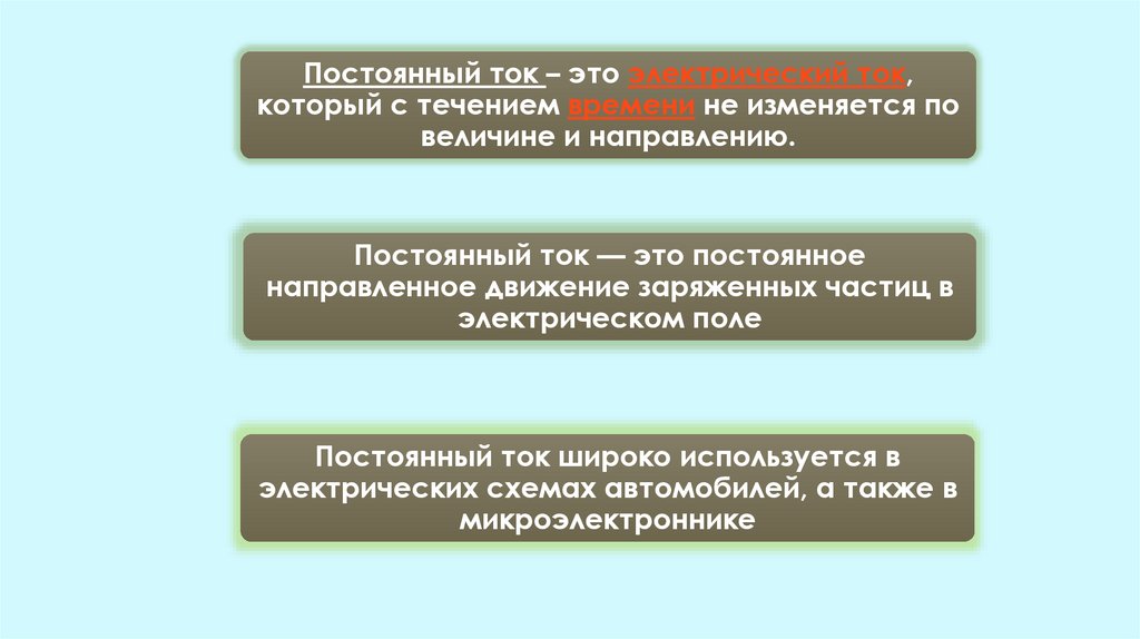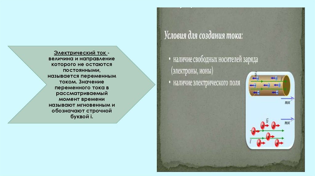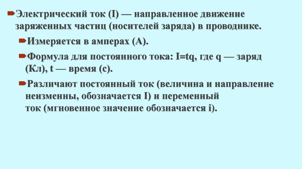 Электрический ток (I) — направленное движениезаряженных частиц (носителей заряда) в проводнике.