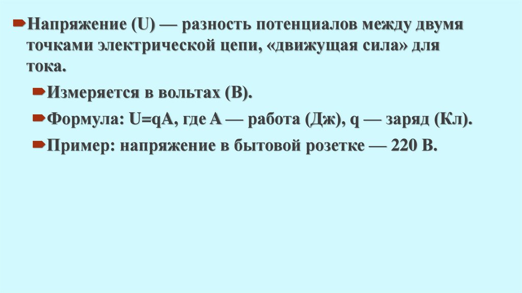 Напряжение (U) — разность потенциалов между двумяточками электрической цепи, «движущая сила» для