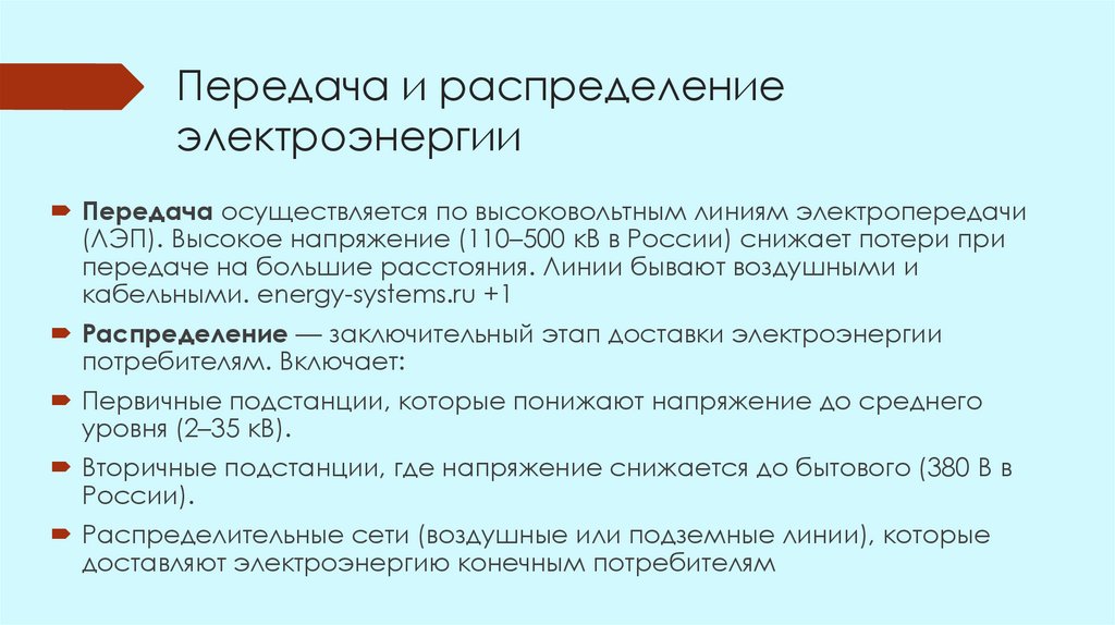 (ЛЭП). Высокое напряжение (110–500 кВ в России) снижает потери при