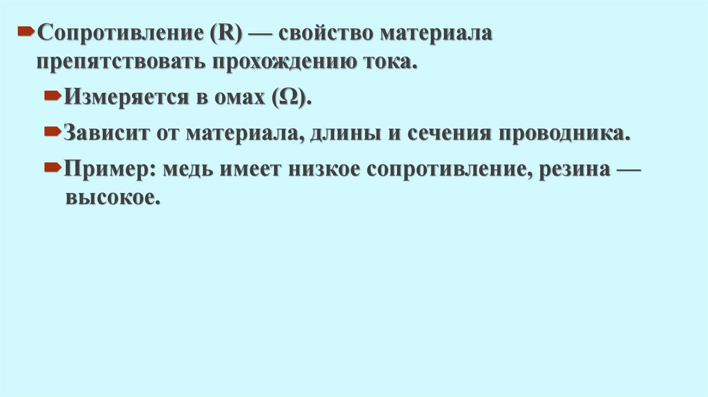 Сопротивление (R) — свойство материалапрепятствовать прохождению тока.