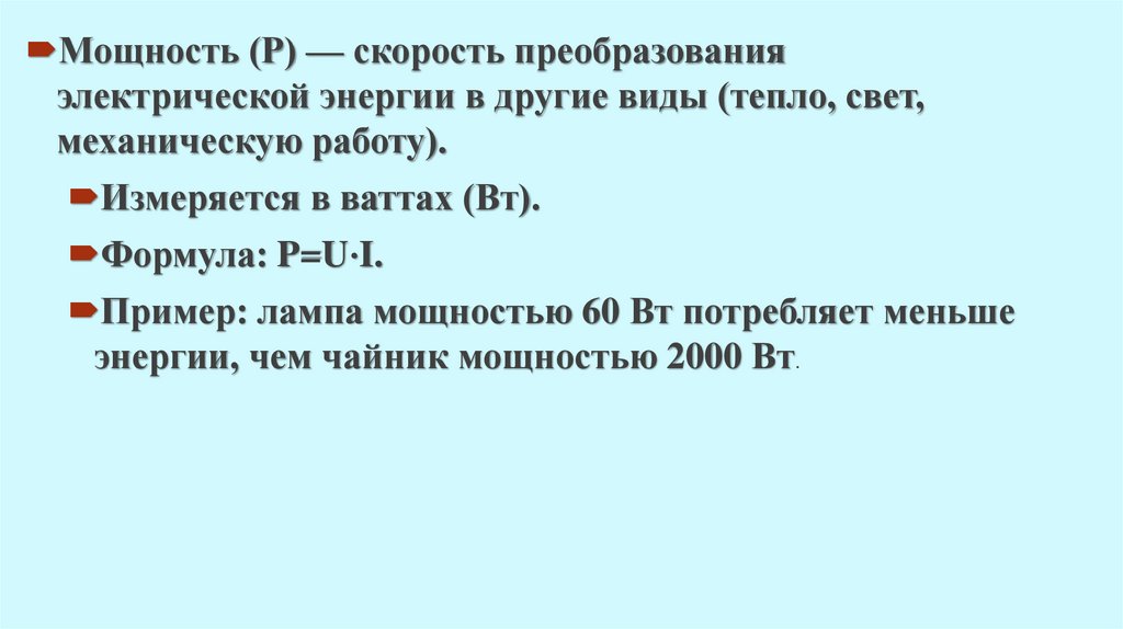 Мощность (P) — скорость преобразованияэлектрической энергии в другие виды (тепло, свет,