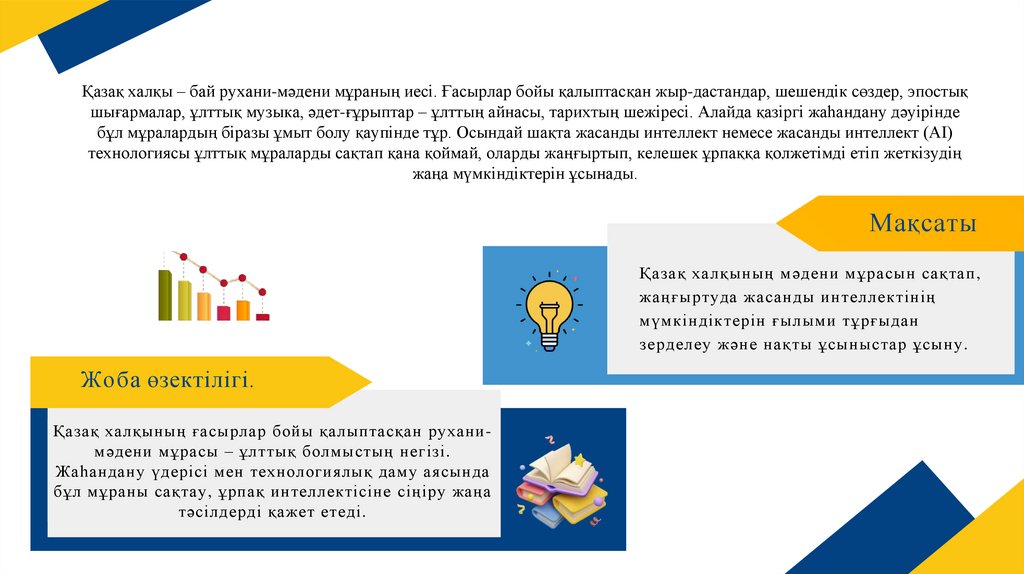 Қазақ халқы – бай рухани-мәдени мұраның иесі. Ғасырлар бойы қалыптасқан жыр-дастандар, шешендік сөздер, эпостықшығармалар, ұлттық музыка, әдет-ғұрыптар – ұлттың айнасы, тарихтың шежіресі. Алайда қазіргі жаһандану дәуірінде