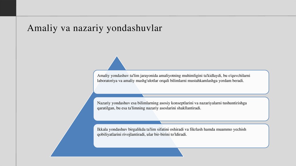Amaliy va nazariy yondashuvlarAmaliy yondashuv ta'lim jarayonida amaliyotning muhimligini ta'kidlaydi, bu o'quvchilarni