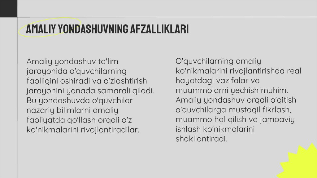 Amaliy yondashuvning afzalliklariAmaliy yondashuv ta'lim