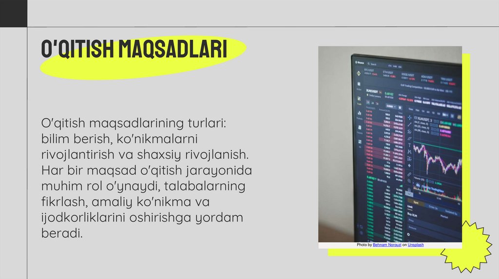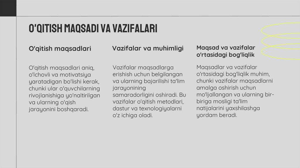 O'qitish maqsadi va vazifalariO'qitish maqsadlari