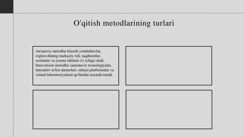O'qitish metodlarining turlariAn'anaviy metodlar klassik yondashuvlar,