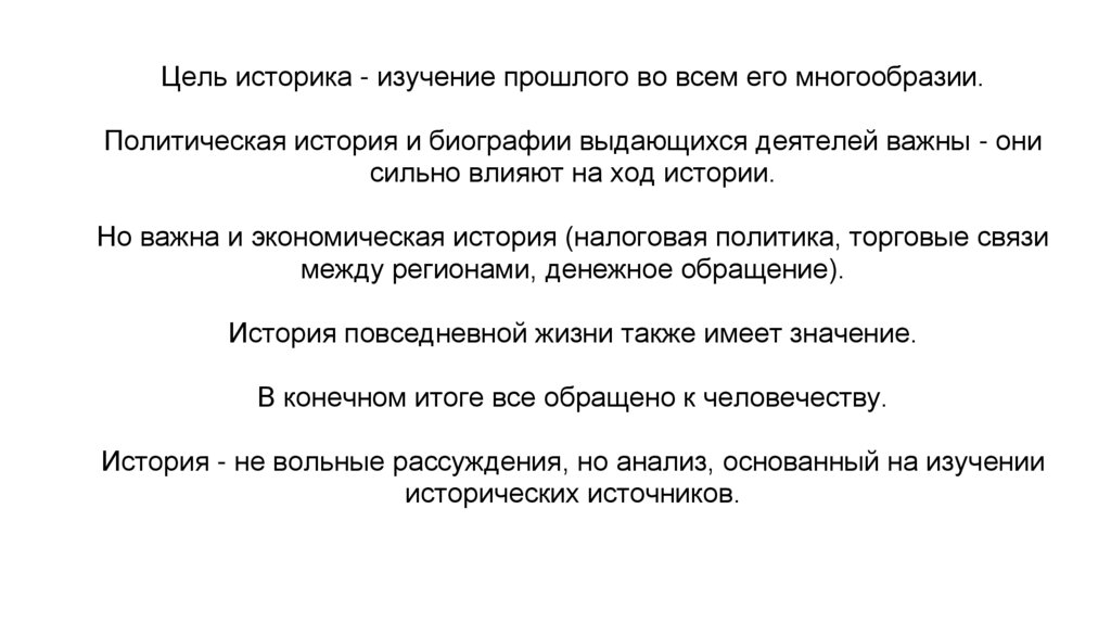 Цель историка - изучение прошлого во всем его многообразии.Политическая история и биографии выдающихся деятелей важны - они