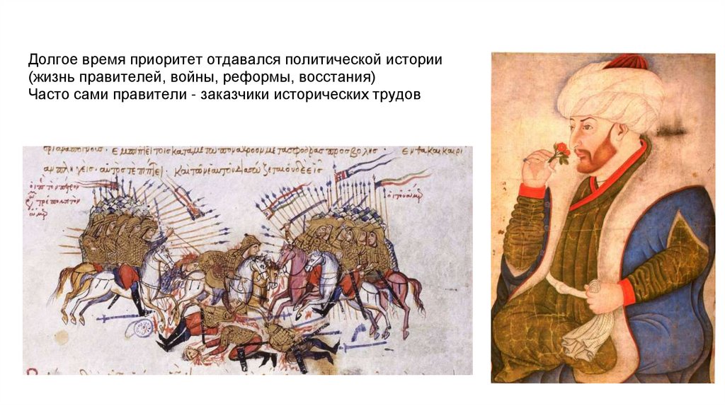 Долгое время приоритет отдавался политической истории(жизнь правителей, войны, реформы, восстания)