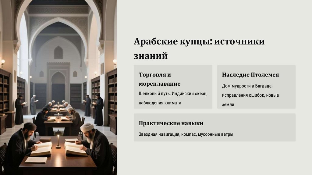 Контроль торговых путей позволил арабам узнать о великих империях, реках и морских маршрутах трех континентов.