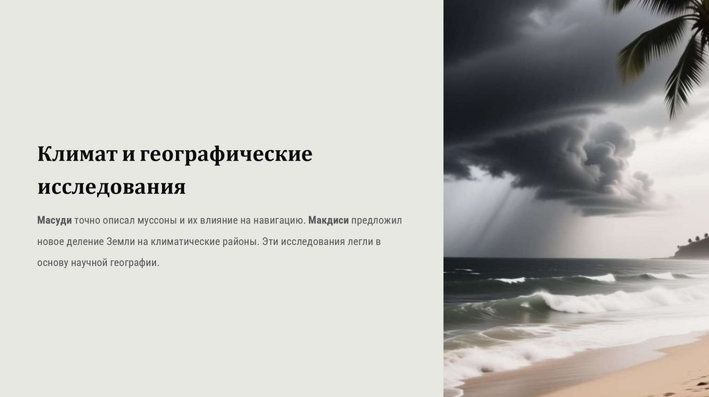Масуди точно описал муссоны и их влияние на навигацию. Макдиси предложил