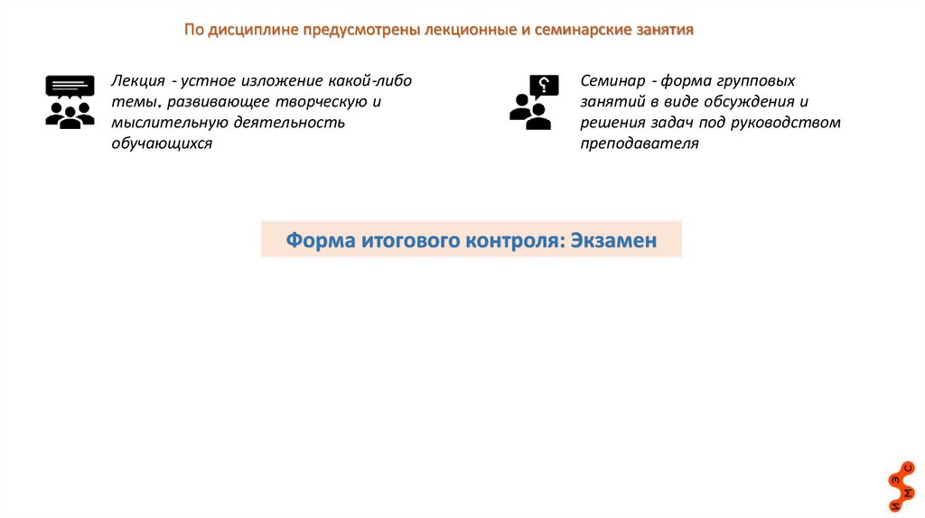 По дисциплине предусмотрены лекционные и семинарские занятияЛекция - устное изложение какой-либо