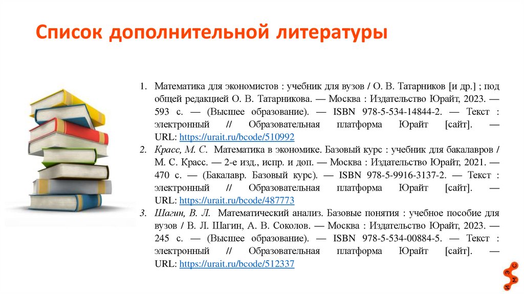 Список дополнительной литературы1. Математика для экономистов : учебник для вузов / О. В. Татарников [и др.] ; под