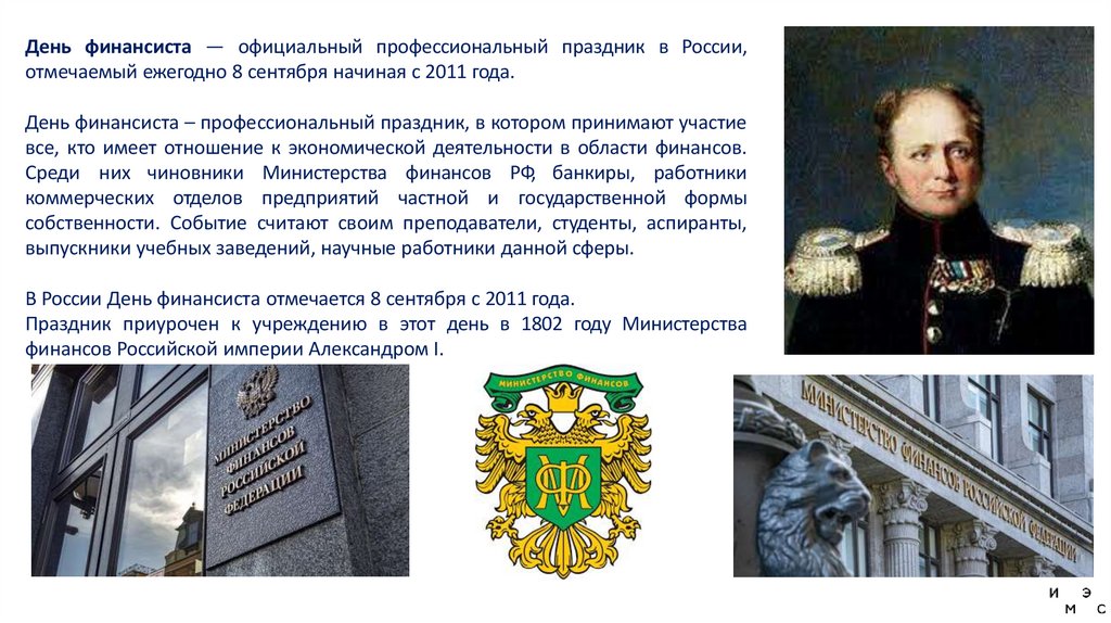 День финансиста — официальный профессиональный праздник в России,отмечаемый ежегодно 8 сентября начиная с 2011 года.