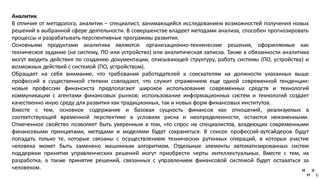 АналитикВ отличие от методолога, аналитик – специалист, занимающийся исследованием возможностей получения новых