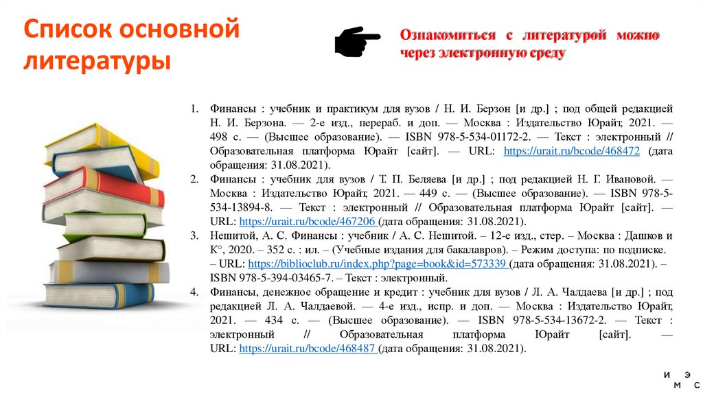 1. Финансы, деньги и кредит : учебник и практикум для вузов / Д. В. Бураков [и др.] ; подредакцией Д. В. Буракова. — 2-е изд., перераб. и доп. — Москва : Издательство Юрайт,