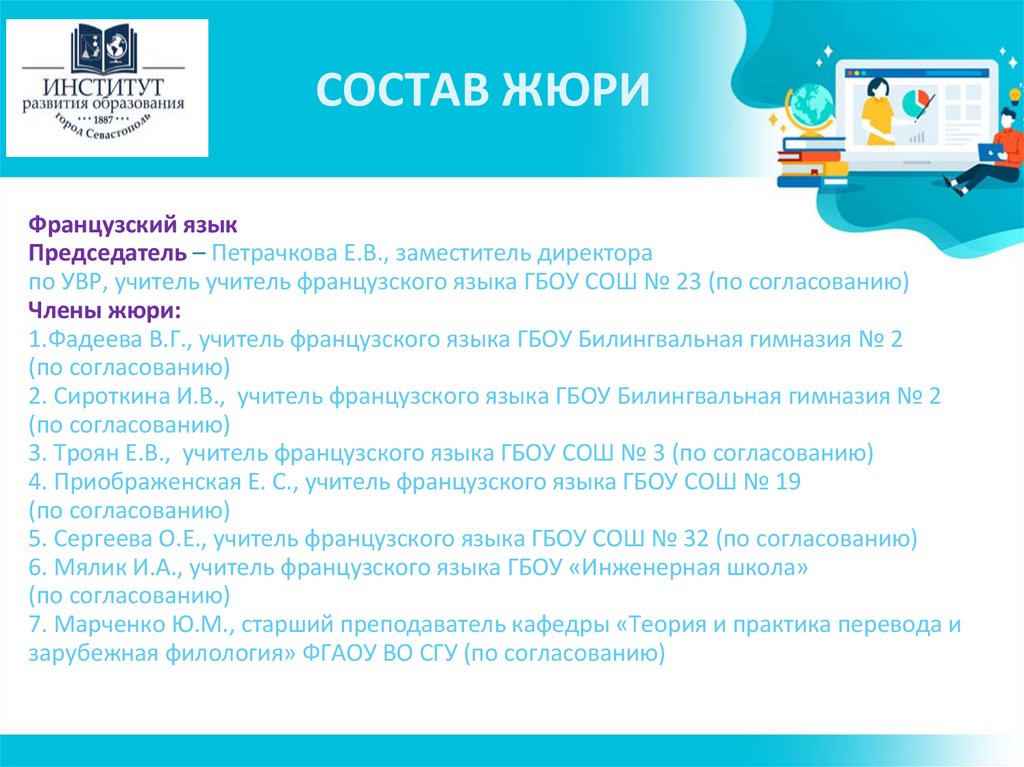 5. Сергеева О.Е., учитель французского языка ГБОУ СОШ № 32 (по согласованию)