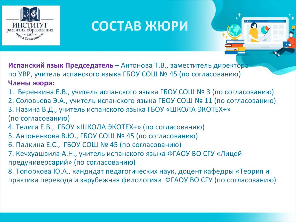 СОСТАВ ЖЮРИИспанский язык Председатель – Антонова Т.В., заместитель директора
