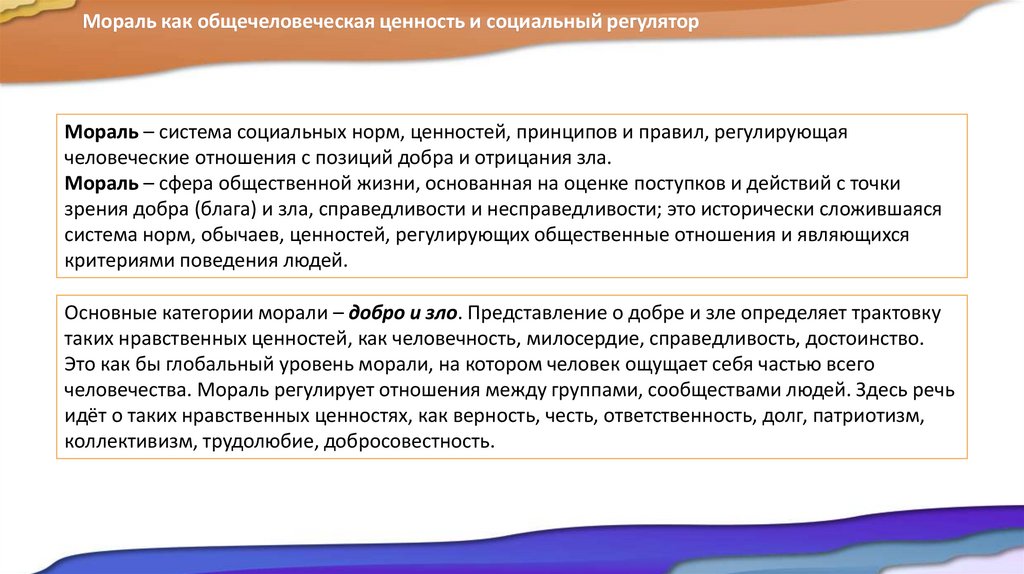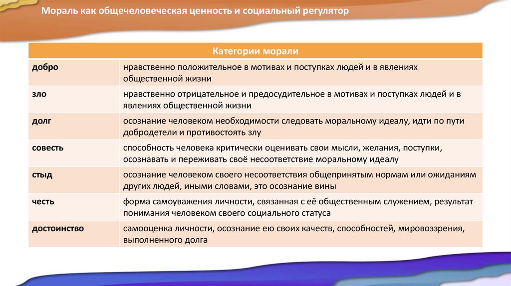Мораль как общечеловеческая ценность и социальный регуляторКатегории морали