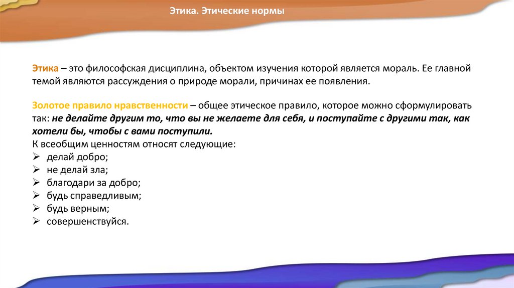 Этика. Этические нормыЭтика – это философская дисциплина, объектом изучения которой является мораль. Ее главной
