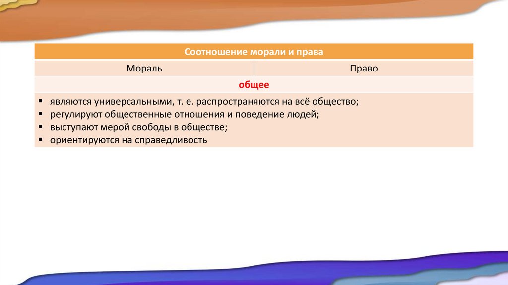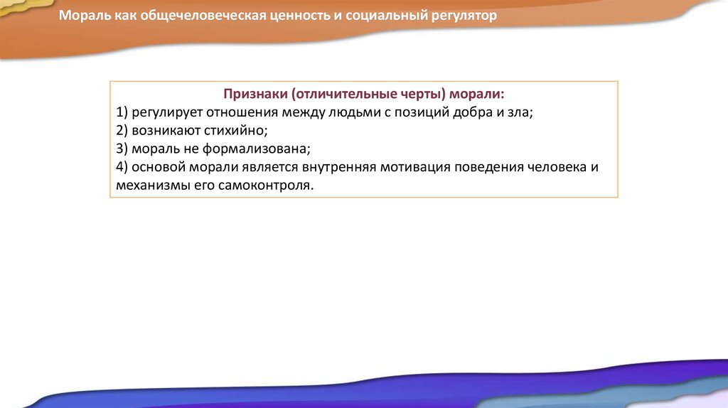 Мораль как общечеловеческая ценность и социальный регуляторПризнаки (отличительные черты) морали: