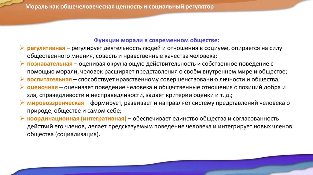 Мораль как общечеловеческая ценность и социальный регуляторФункции морали в современном обществе: