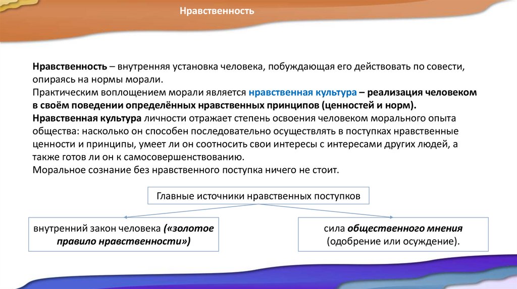 НравственностьНравственность – внутренняя установка человека, побуждающая его действовать по совести,