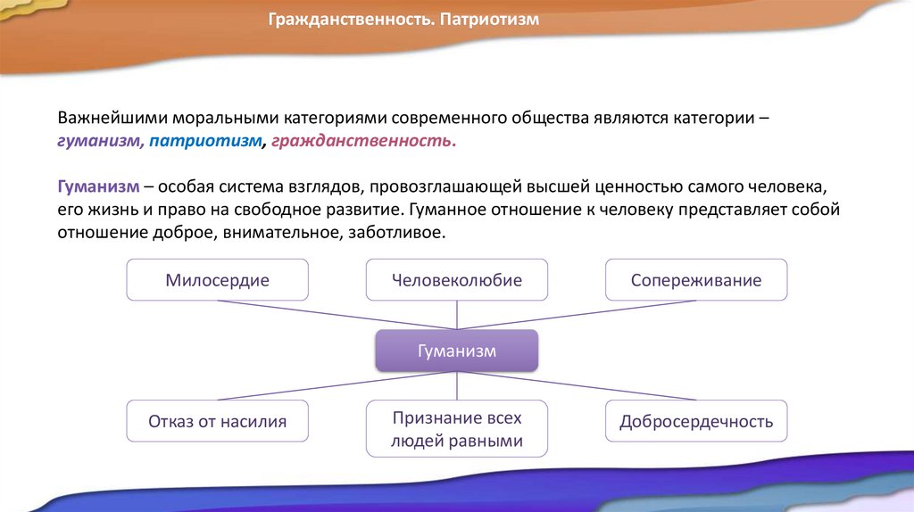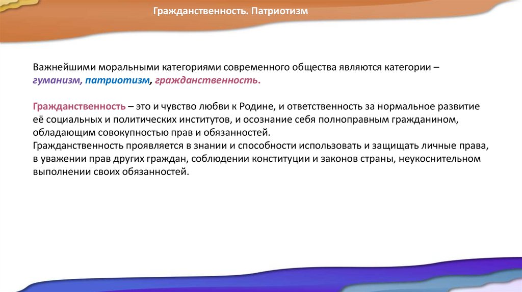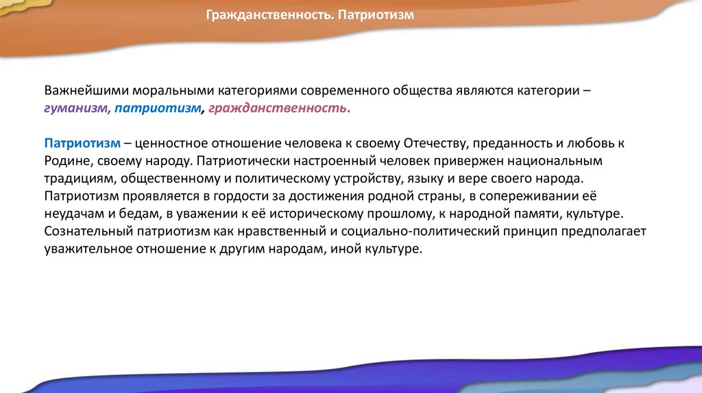 Гражданственность. ПатриотизмВажнейшими моральными категориями современного общества являются категории –