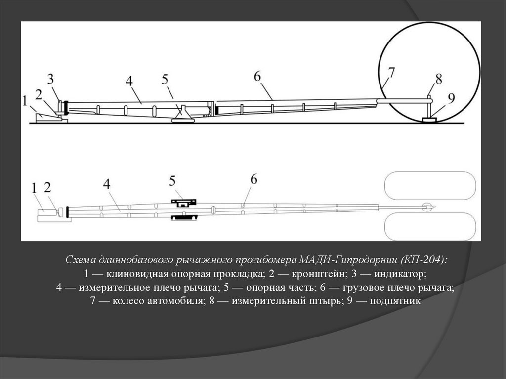Схема длиннобазового рычажного прогибомера МАДИ-Гипродорнии (КП-204):1 — клиновидная опорная прокладка; 2 — кронштейн; 3 — индикатор;