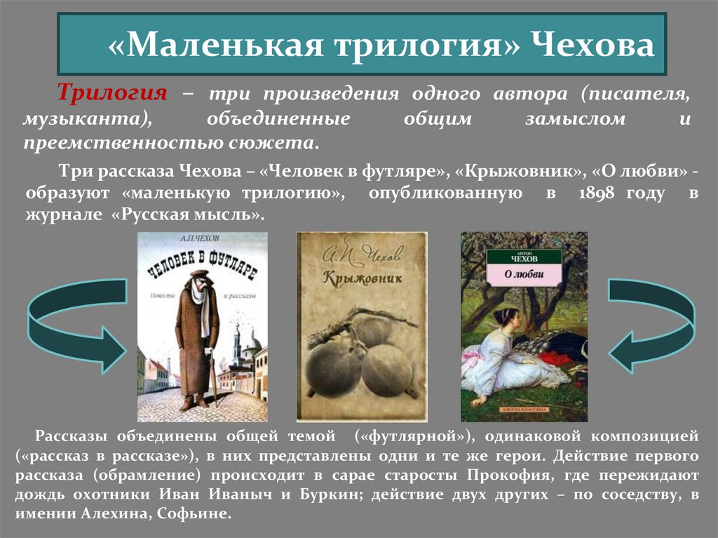 Три рассказа Чехова – «Человек в футляре», «Крыжовник», «О любви» образуют «маленькую трилогию», опубликованную в 1898 году в