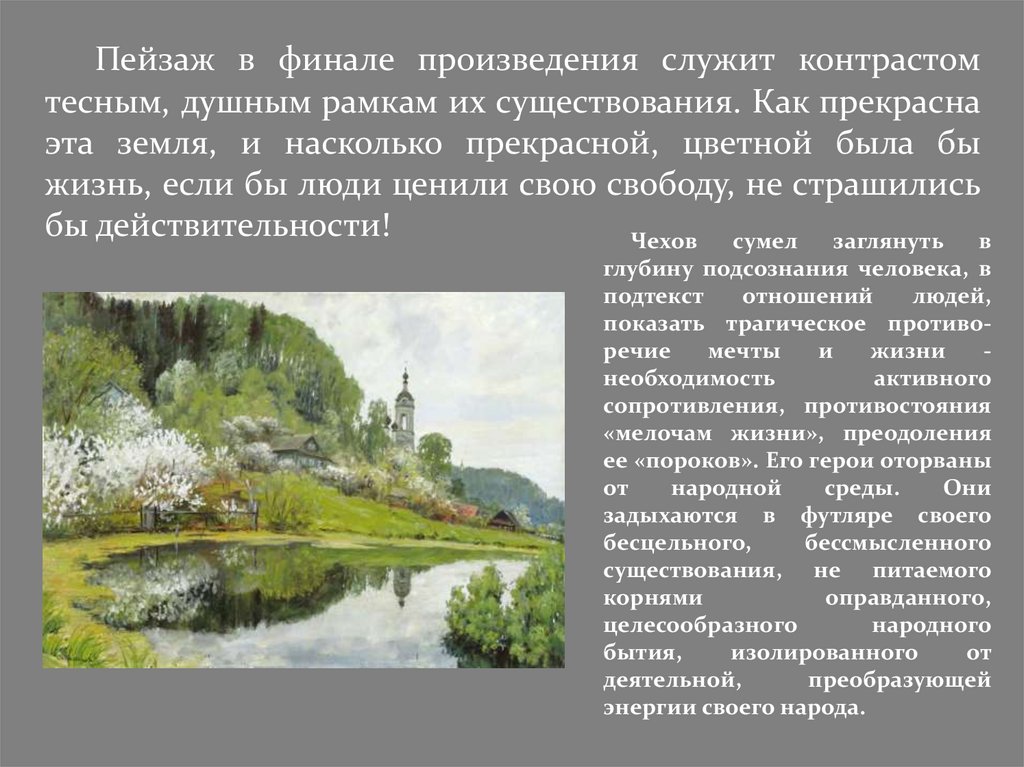 Пейзаж в финале произведения служит контрастомтесным, душным рамкам их существования. Как прекрасна
