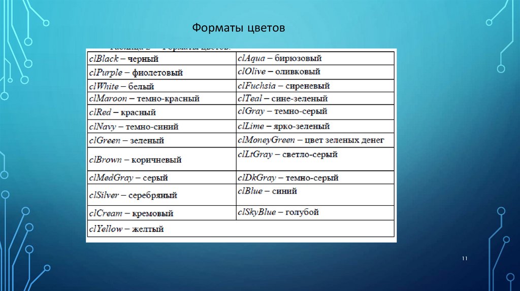 clBlack – черный clAqua – бирюзовый