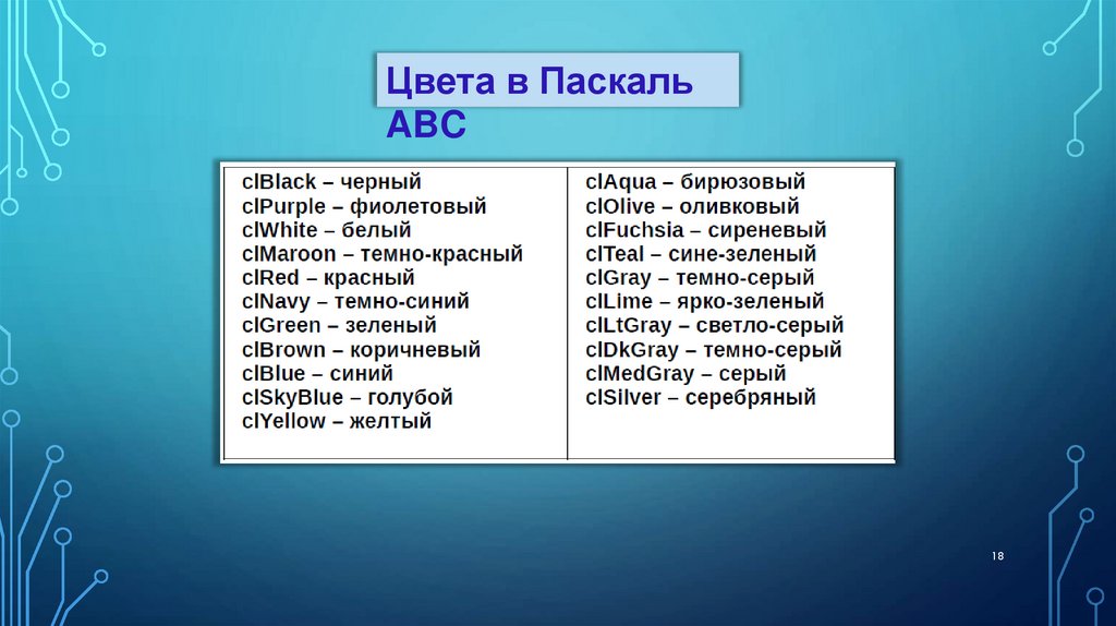clMaroon – темно-красный clTeal – сине-зеленый