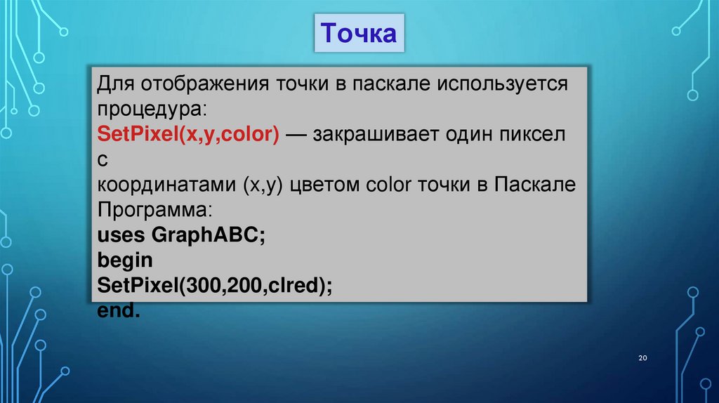 3. Впишите в тело программы процедуру рисования точки Setpixel с координатами