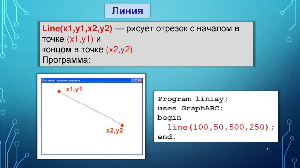 5. Постройте отрезок зелёного цвета процедурой Line от точки