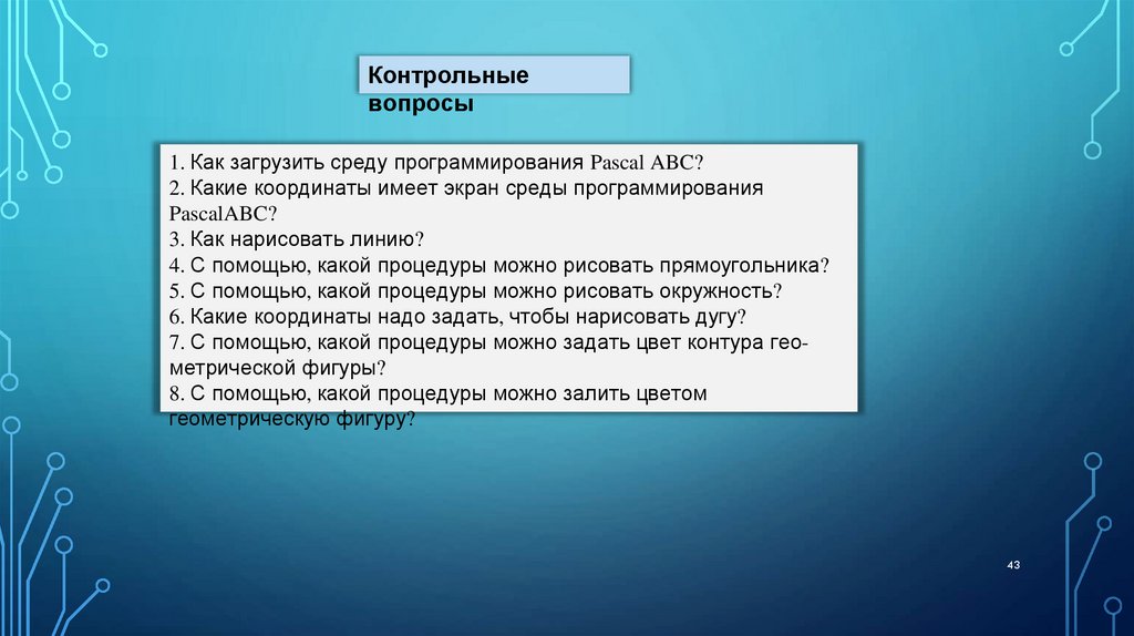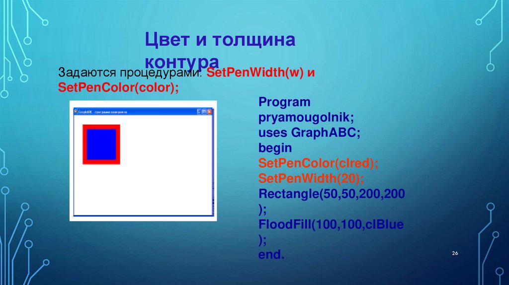 7. С помощью, какой процедуры можно задать цвет контура геометрической фигуры?