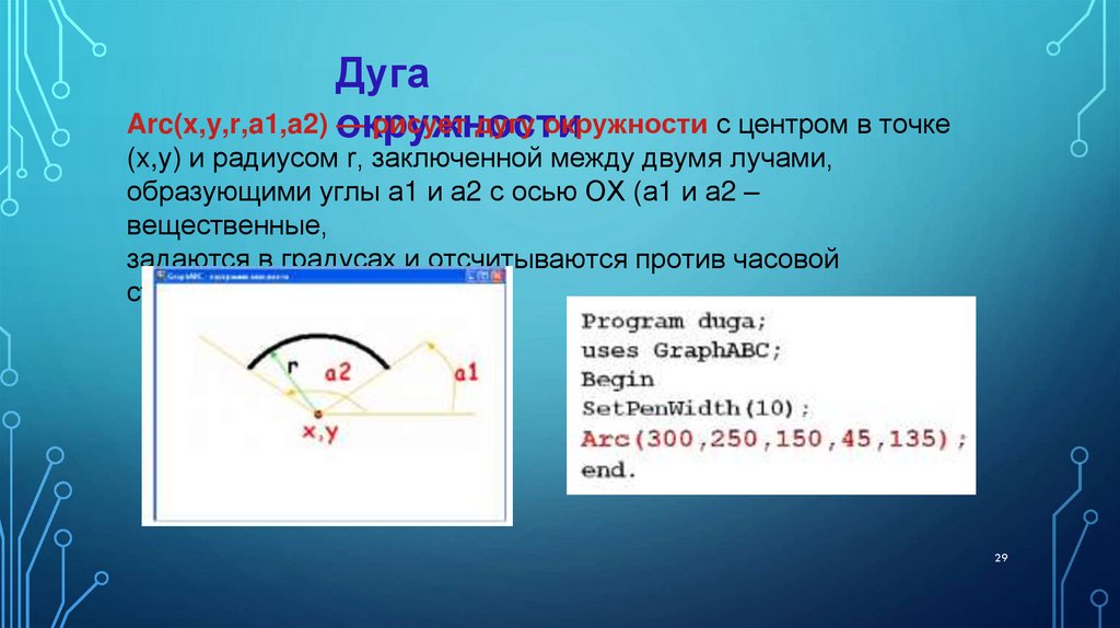 11. Изобразите дугу процедурой Arc в точке (50,120), радиусом 50, угол начала 0,