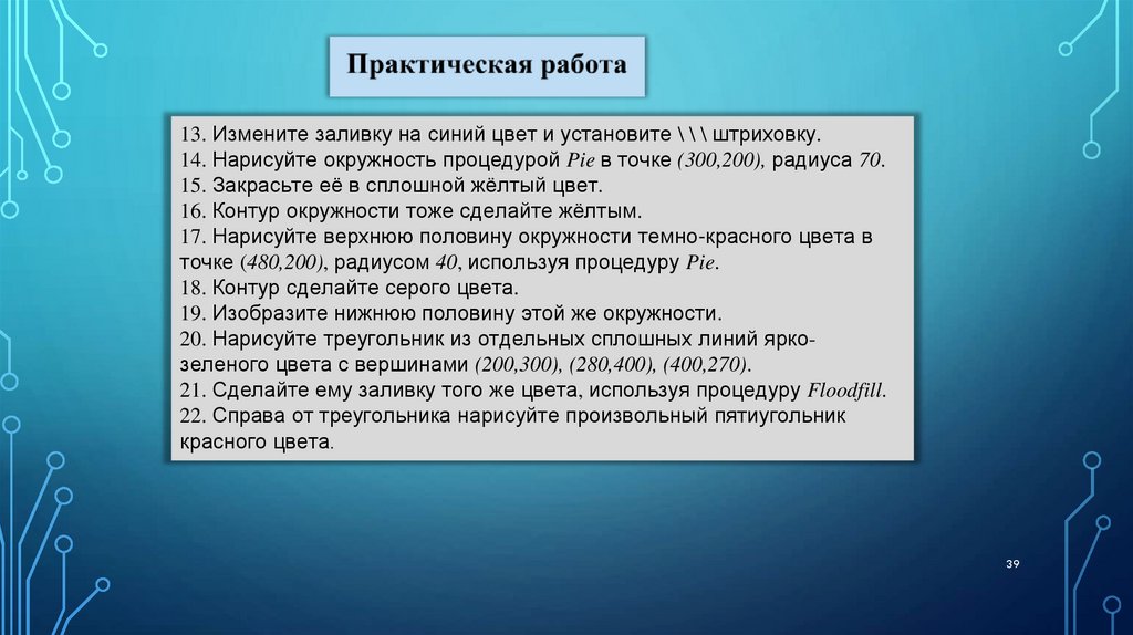 13. Измените заливку на синий цвет и установите \ \ \ штриховку.14. Нарисуйте окружность процедурой Pie в точке (300,200), радиуса 70.